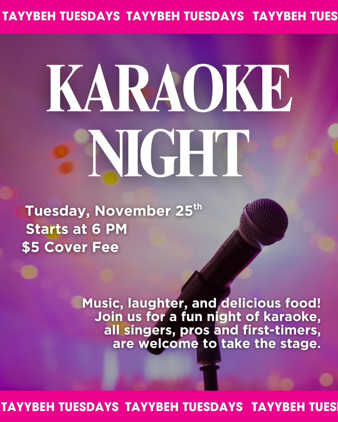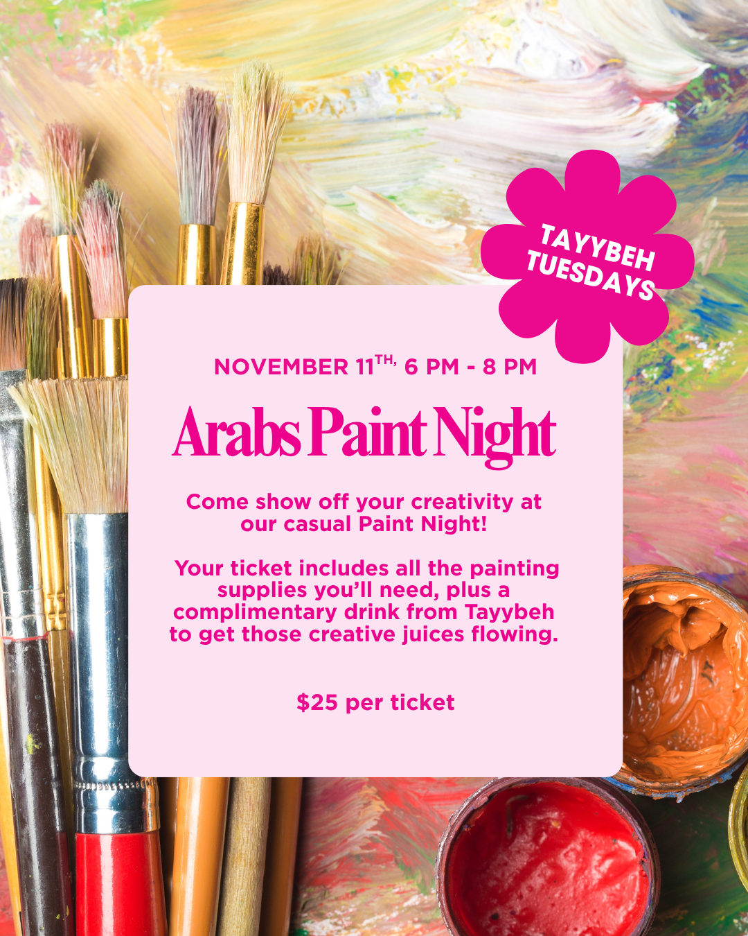 Your $25 ticket covers everything: all your painting supplies and a complimentary drink from Tayybeh to get the good times flowing.No need to be a pro. Just join us for good vibes, great company, and, of course, delicious food (our full menu will be available!)