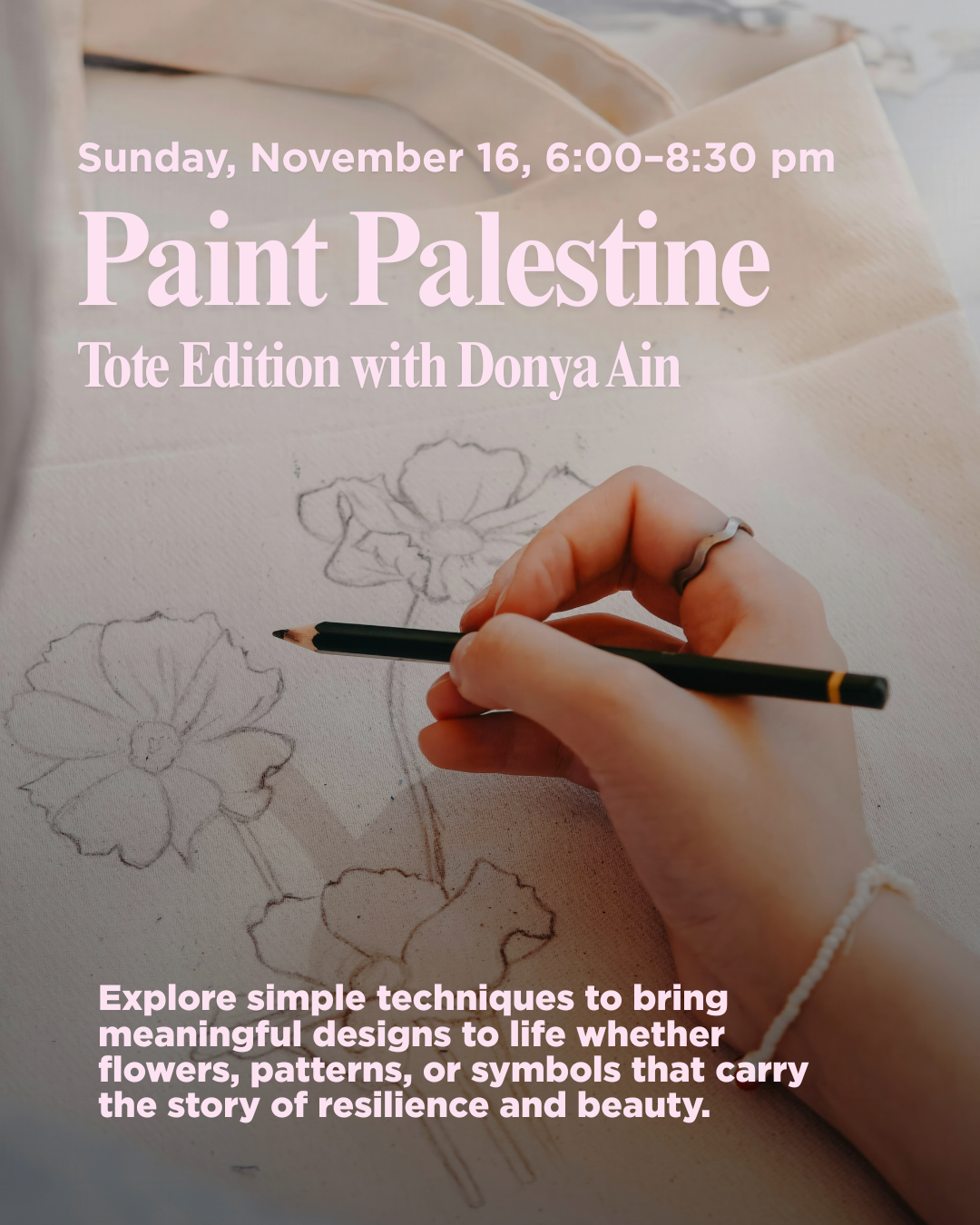Donya's work is a heartfelt tribute, and this is your chance to channel that spirit, designing a tote bag that tells a story of the land's beauty and resilience.Come create with heart.