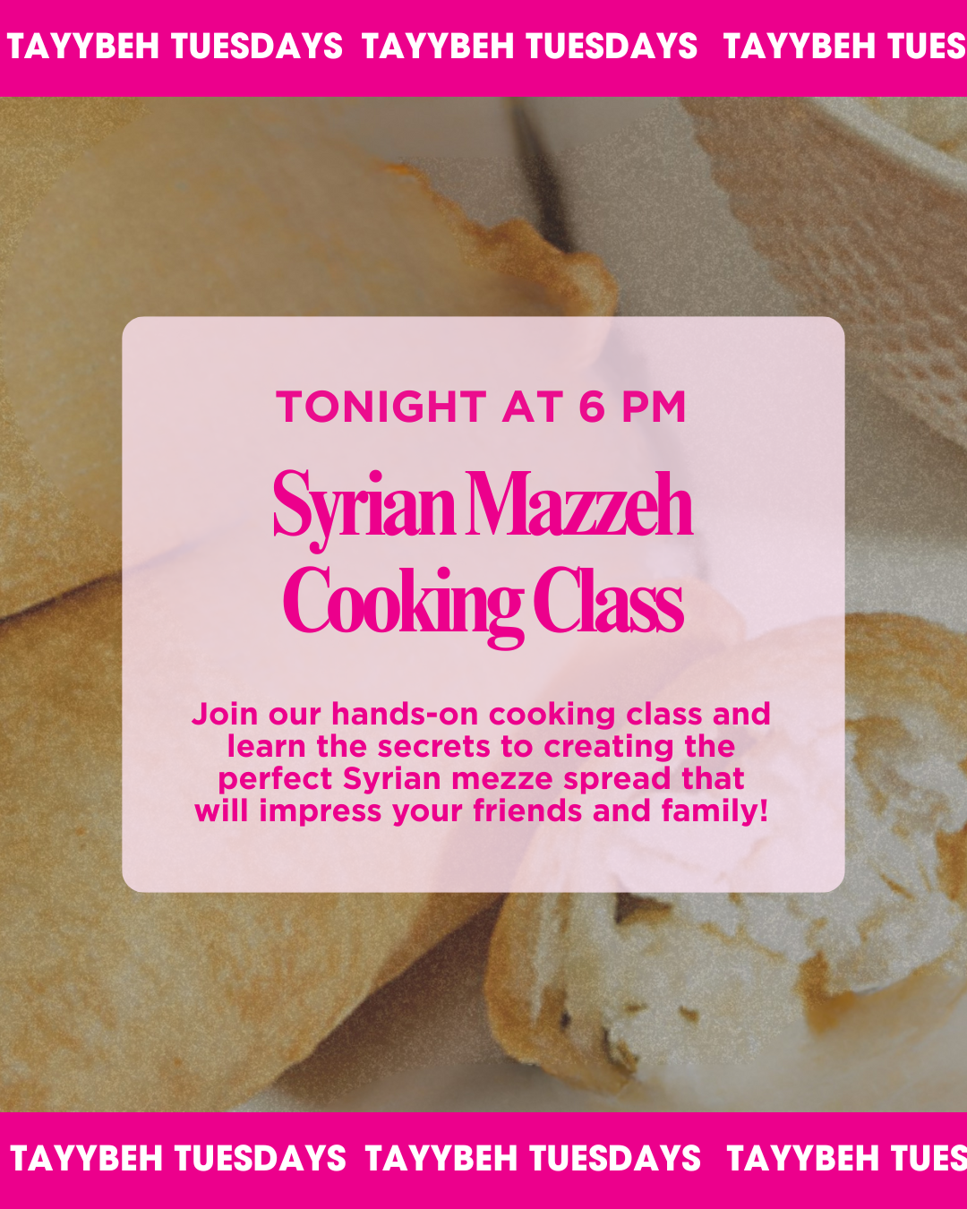You'll leave knowing how to create velvety-smooth Hummus, flaky Cheese Sambusak, zesty Tabbouleh, Yalanji, and the delicate sweet Lady's Bracelet.No matter your current skill level, come learn, laugh, and eat incredible food with us!
